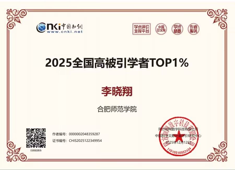 近日,中国知网中国科学文献计量评价研究中心公布了“2025中国知网高被引学者”发布名单,我院李晓翔教授、刘经涛博士入选高被引学者名单。其中,李晓翔教授入选“2025中国知网高被引学者”Top1%名单,刘经涛博士入选“2025中国知网高被引学者”Top5%名单。