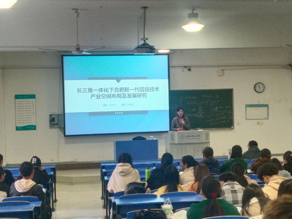 本网讯 11月25日,yl88858永利集团副教授刘冬萍在锦绣校区逸夫楼A309教室举行了主题为“长三角一体化下合肥新一代信息技术产业空间布局及发展研究”的学术报告,2020级经济学专业学生到场聆听了报告。
