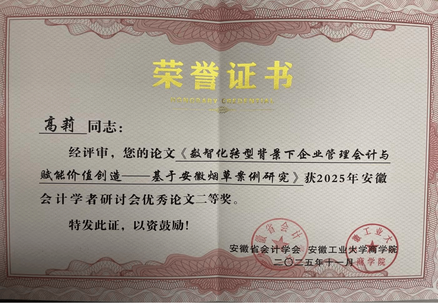 研讨会上,我院高莉老师汇报了撰写的论文《数智化转型背景下企业管理会计与赋能价值创造—基于安徽烟草案例研究》。该论文围绕“数智化转型背景下的企业管理会计创新”展开深入研究,系统梳理了相关领域的研究现状,通过案例分析、实证研究等方法揭示了关键问题与解决路径。论文得到了与会专家的一致好评,荣获研讨会“优秀征文二等奖”。