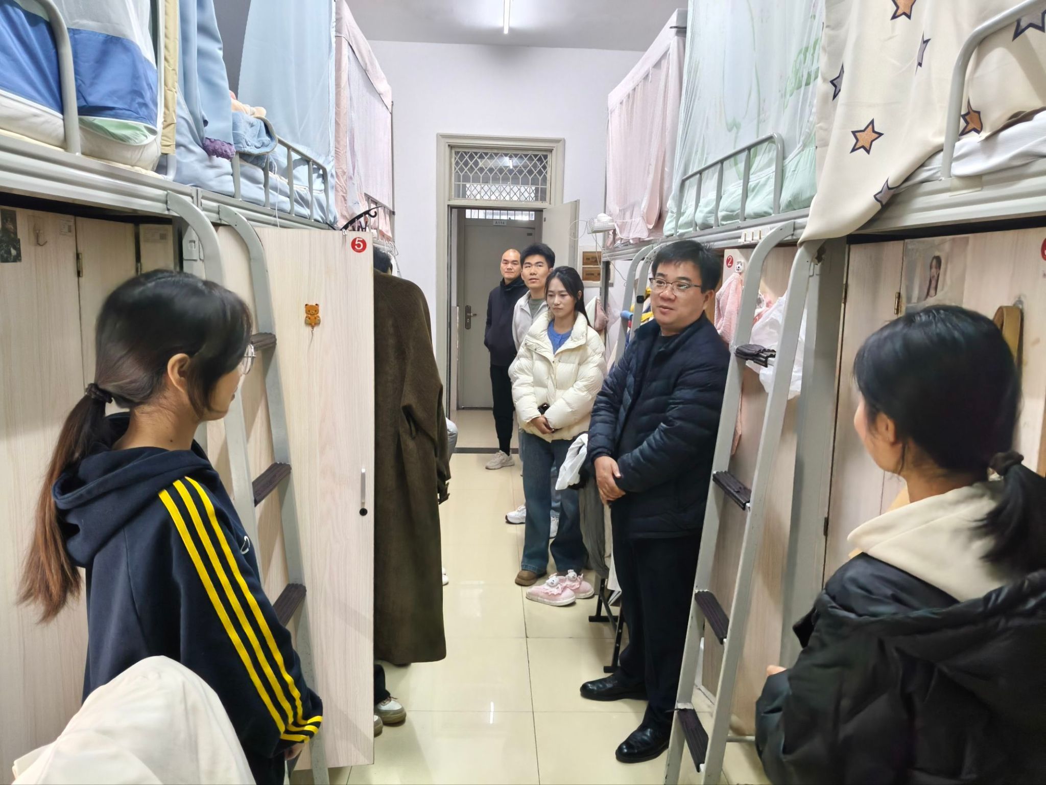 11月20日下午,陈好一行来到滨湖校区学生宿舍,亲切看望学生,细致了解了大家的日常生活与学习情况。检查过程中,陈好重点查看了宿舍用电安全、消防设施、内务整理等方面,并与同学们面对面交流。他强调,宿舍是同学们在校生活的重要空间,维护好宿舍内部关系、共建和谐氛围至关重要。他指出,要坚决杜绝违规用电行为,严禁使用大功率电器等,切实防范消防安全隐患。同时陈好亲切地叮嘱同学们要以学业为重,合理安排时间,营造积极健康的宿舍文化,共同守护文明安全、整洁干净的生活环境。辅导员蒋诗伟、高劲成、王梦凡、黄翔陪同检查。