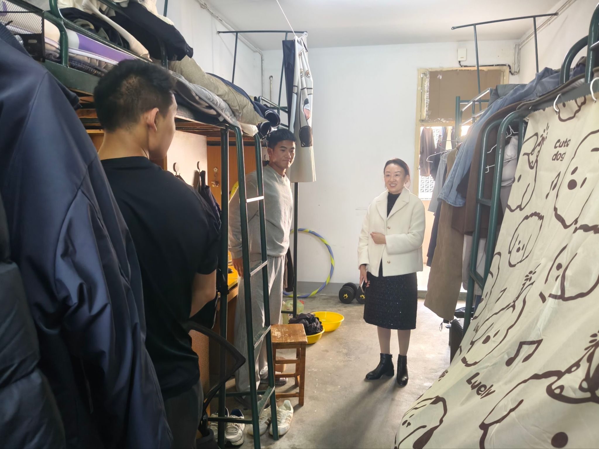 11月21日中午,陶敏在锦绣校区继续开展宿舍安全巡查工作。她仔细查看了各宿舍的卫生状况,物品摆放及公共设施使用情况,并就存在的问题现场提出了整改意见。陶敏在检查中表示,安全无小事,同学们要不断增强自我保护意识,自觉遵守校纪校规,做到防微杜渐。辅导员徐文、黄翔陪同参与检查。